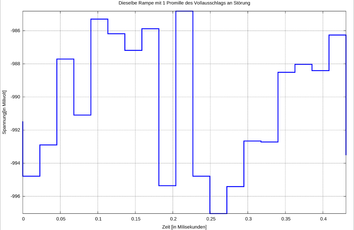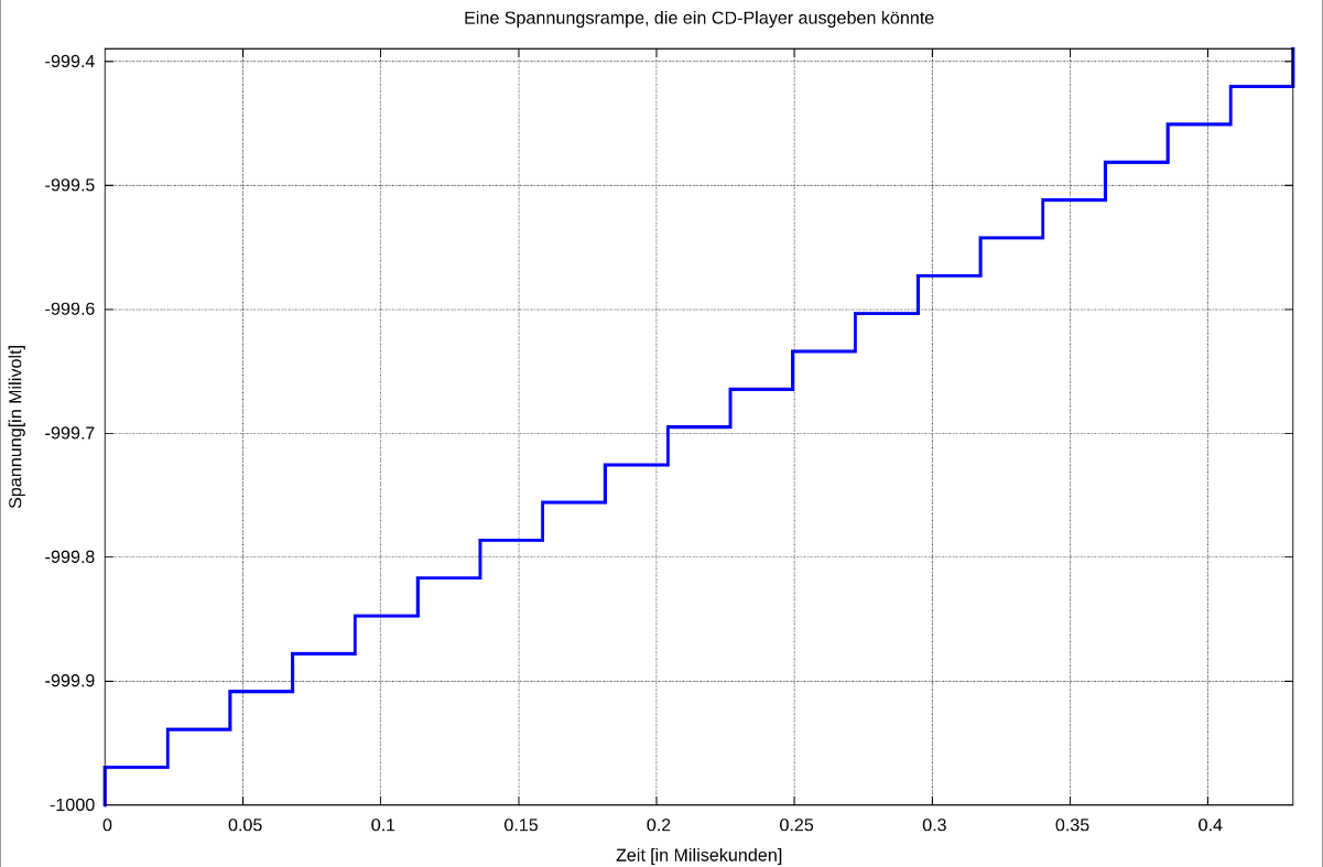 Die oben dargestellte Rampe ist allerdings selbst mit 0,1% an Fehler auf der maximal möglichen Ausgangsspannung des CD-Players fast nicht mehr erkennbar: