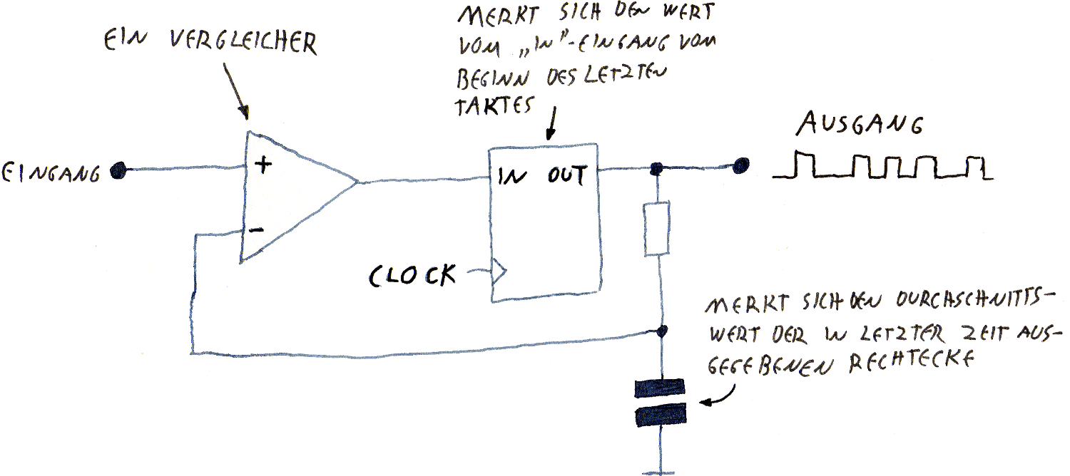 Ein Vergleicher misst einmal pro Quarztakt, ob ein Kondensator eine höhere oder eine niedrigere Spannung enthält, als sie das Mikrophon erzeugt. Ist die Spannung am Kondensator höher, wird der Kondensator den nächsten Takt über entladen, ansonsten lädt die Schaltung ihn den nächsten Takt lang ein Stückweit auf.